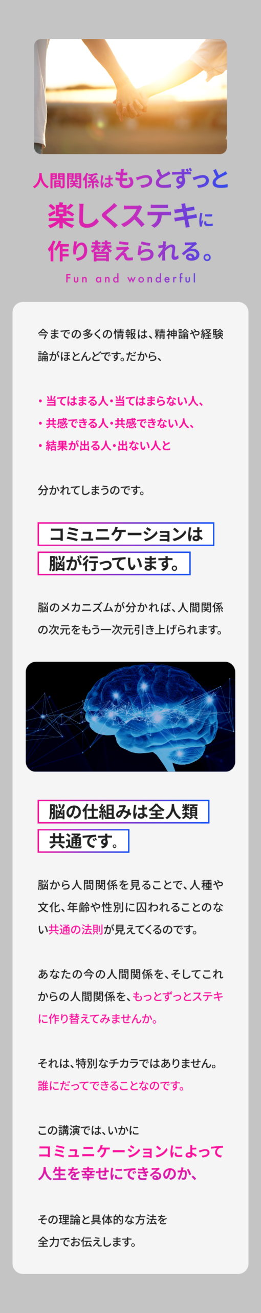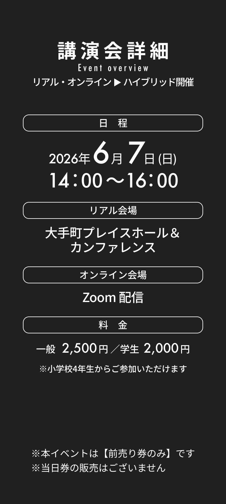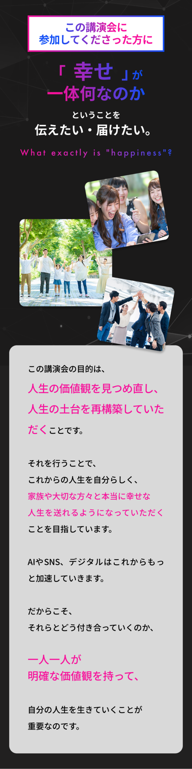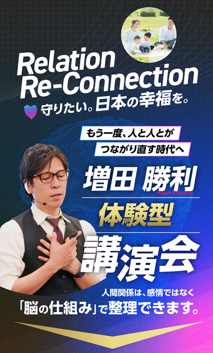 この講演会の目的は、 人生の価値観を見つめ直し、人生の土台を再構築していただくことです。 それを行うことで、 これからの人生を自分らしく、 家族や大切な方々と本当に幸せな 人生を送れるようになっていただくことを目指しています。 AIやSNS、デジタルはこれからもっと加速していきます。 だからこそ、 それらとどう付き合っていくのか、 一人一人が 明確な価値観を持って、 自分の人生を生きていくことが 重要なのです。