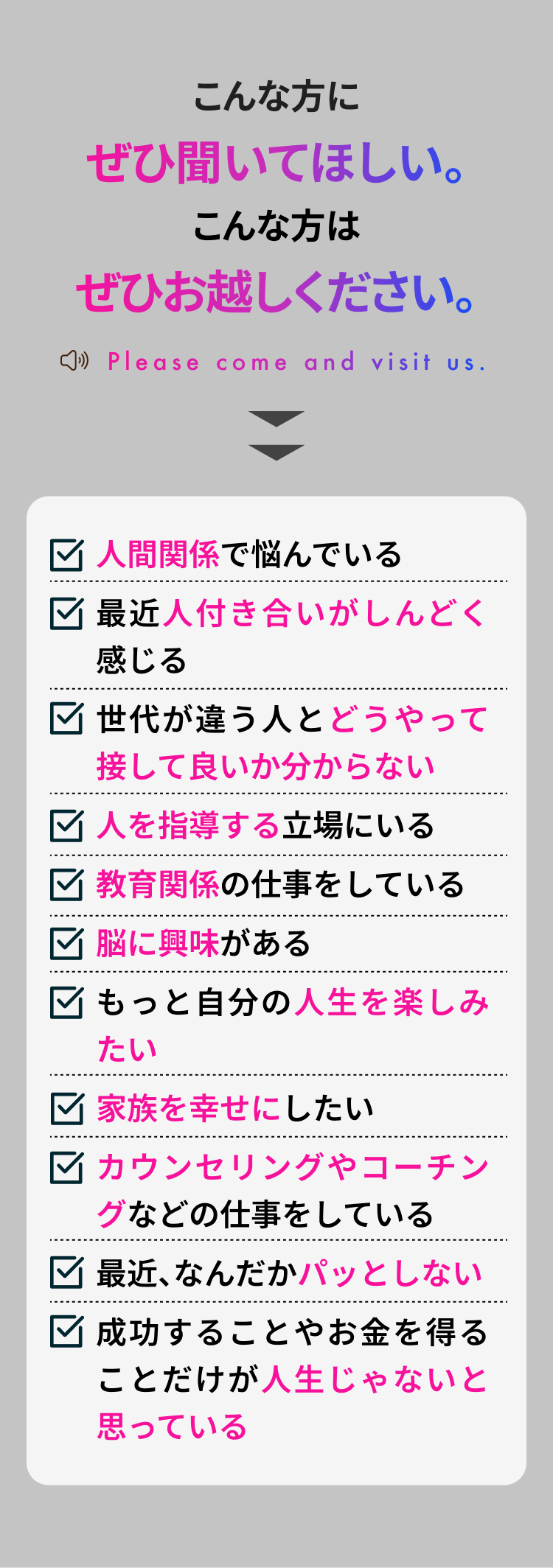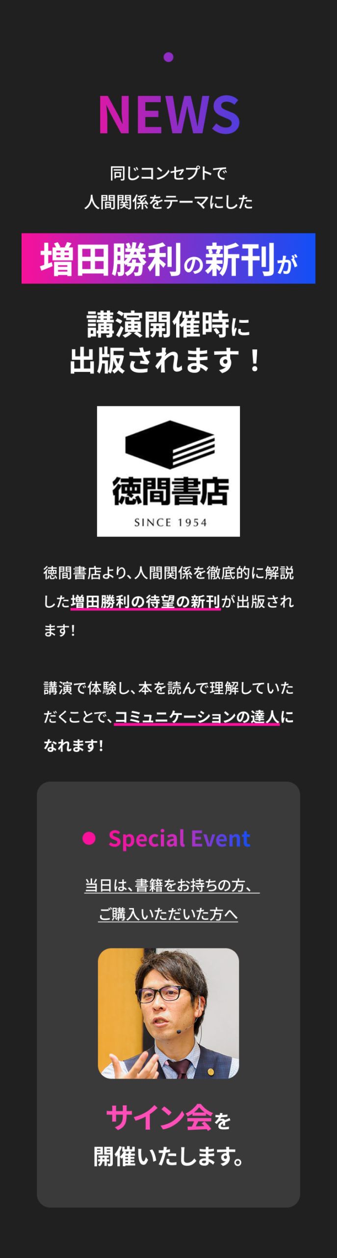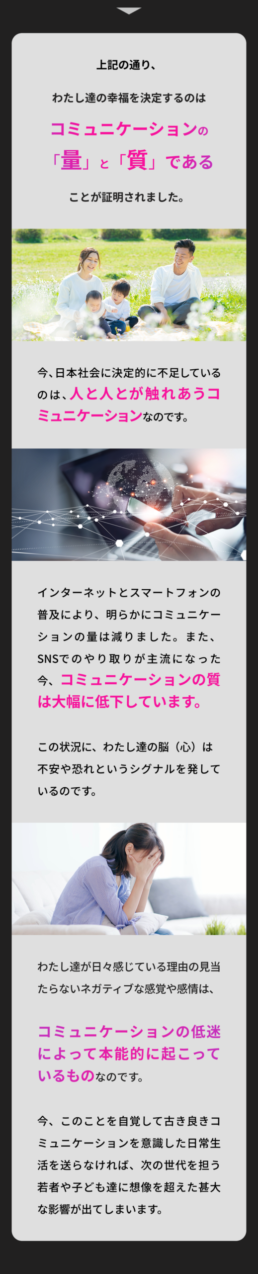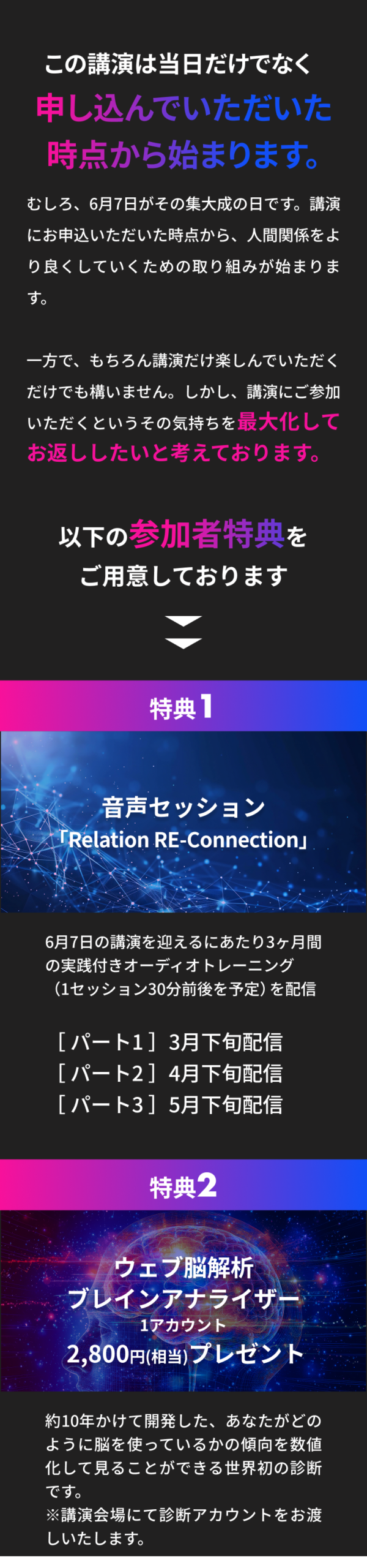 この講演会の目的は、 人生の価値観を見つめ直し、人生の土台を再構築していただくことです。 それを行うことで、 これからの人生を自分らしく、 家族や大切な方々と本当に幸せな 人生を送れるようになっていただくことを目指しています。 AIやSNS、デジタルはこれからもっと加速していきます。 だからこそ、 それらとどう付き合っていくのか、 一人一人が 明確な価値観を持って、 自分の人生を生きていくことが 重要なのです。